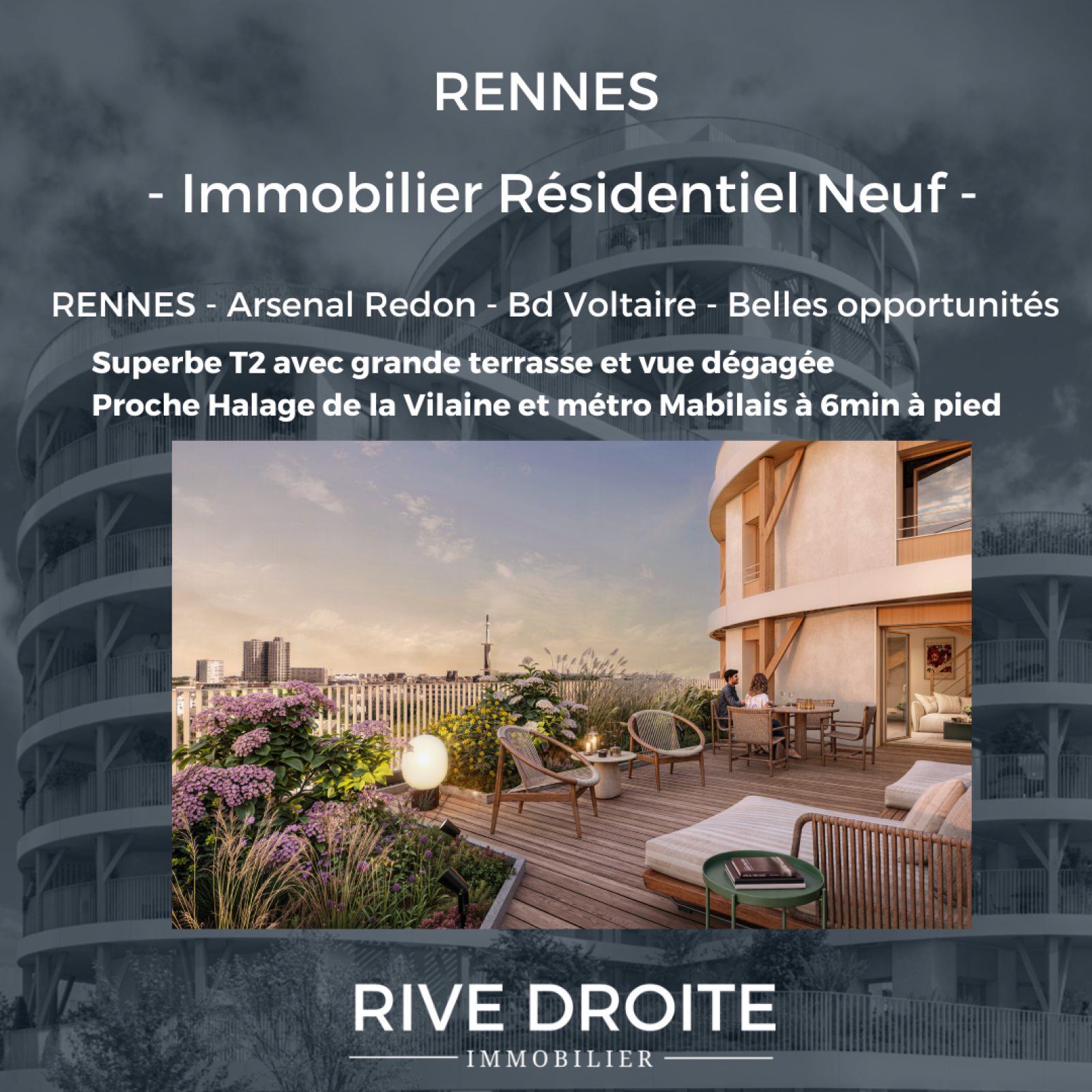 RIVE DROITE vous propose : OPPORTUNITE A NE PAS MANQUER - RENNES Bd Voltaire - Emplacement idéal à 750m du halage et des bords de Vilaine pour de belles ballades, du métro Anatole France à 6min à pied, découvrez cette belle résidence à l'architecture très moderne. Découvrez sans tarder ce SUPERBE T2 avec TERRASSE et BELLES VUES DEGAGEES - INVESTISSEMENT DE QUALITE - IDEAL pour LOCATIF PATRIMONIAL ou PREMIERE ACQUISITION - FRAIS DE NOTAIRE REDUITS - ELIGIBLE PRET A TAUX ZERO - DISPO 2028 - RARE SUR LE MARCHE - RESERVEZ LE DES MAINTENANT !